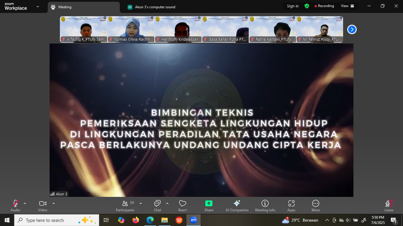 Samarinda, 7 Juli 2025, Hakim A. Taufiq Kurniawan, S.H., M.H. mengikuti Bimbingan Teknis Pemeriksaan Sengketa Lingkungan Hidup Di Lingkungan Peradilan Tata Usaha Negara Pasca Berlakunya Undang Undang Cipta Kerja secara daring. Bimbingan Teknis tersebut diselenggarakan oleh Direktorat Jenderal Badan Peradilan Militer dan Peradilan Tata Usaha Negara dan berlangsung 3 hari yaitu tanggal 6 Juli 2025 sampai dengan 8 Juli 2025.