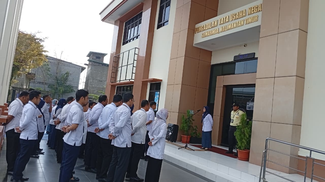 Samarinda, 13 Oktober 2025. Pelaksanaan Apel Pagi dipimpin oleh Hakim PTUN Samarinda, Nidaul Khairat, S.H.I., S.H., M.Kn. Dalam amanatnya beliau menyampaikan untuk selalu mentaati Perma 7, 8, 9 Tahun 2016, PP 94 Tahun 2021, Kode Etik Hakim, Panitera, Jurus Sita dan Kode Etik ASN.