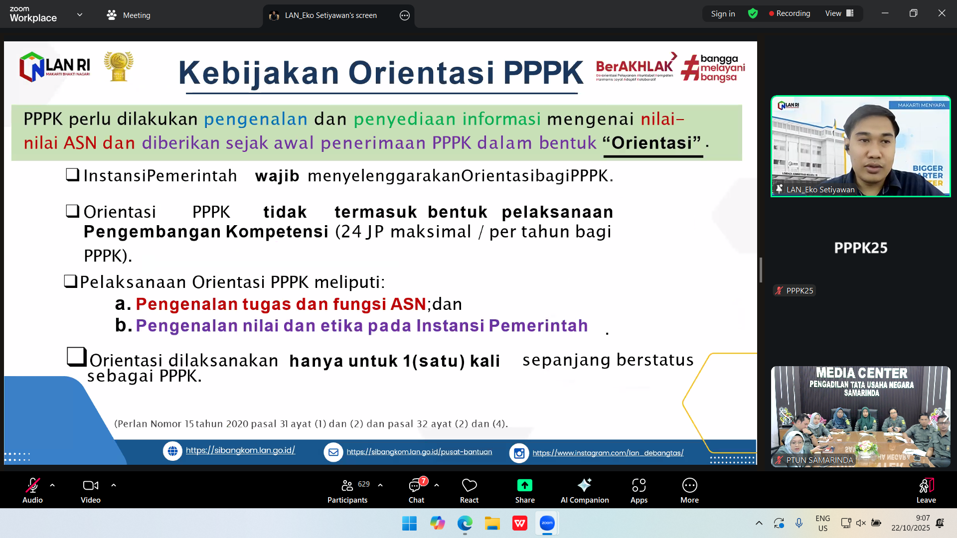Samarinda, 22 Oktober 2025. Overview Batch V Peserta Orientasi Pegawai Pemerintah dengan Perjanjian Kerja (PPPK) Tahun 2025 yang diselenggarakan oleh Badan Strajak Diklat Kumdil Mahkamah Agung RI. Kegiatan tersebut diikuti oleh 9 orang Pegawai Pemerintah dengan Perjanjian Kerja (PPPK) PTUN Samarinda di Ruang Media Center.